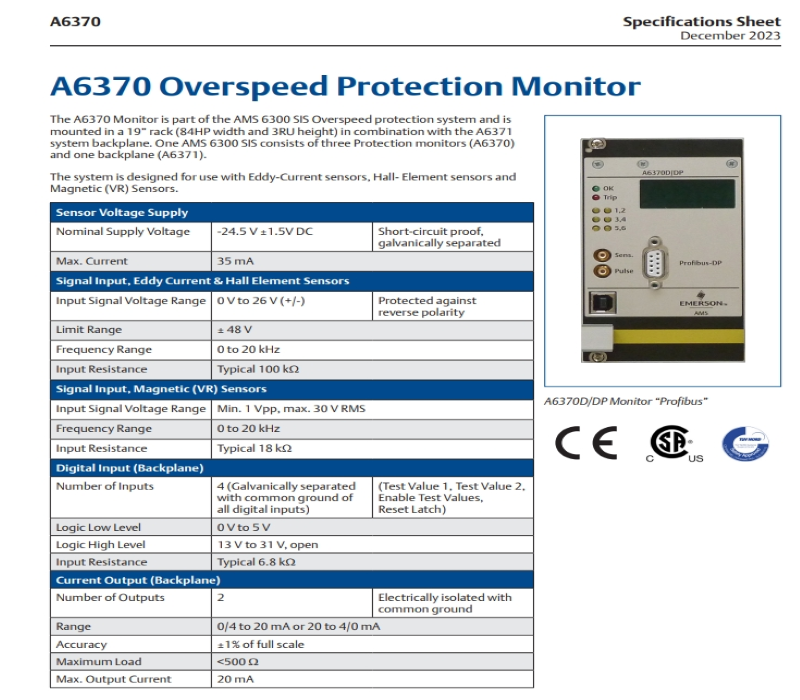 $888A6370D Emerson AMS 6300 Overspeed Protection Monitor